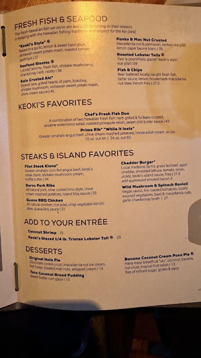 Greater omaha's corn fed angus beef, keoki's steak diane with mushroom risotto, shiitake mushroom cream, truffle butter *Consuming raw or undercooked foods may increase your risk of foodborne illness.
